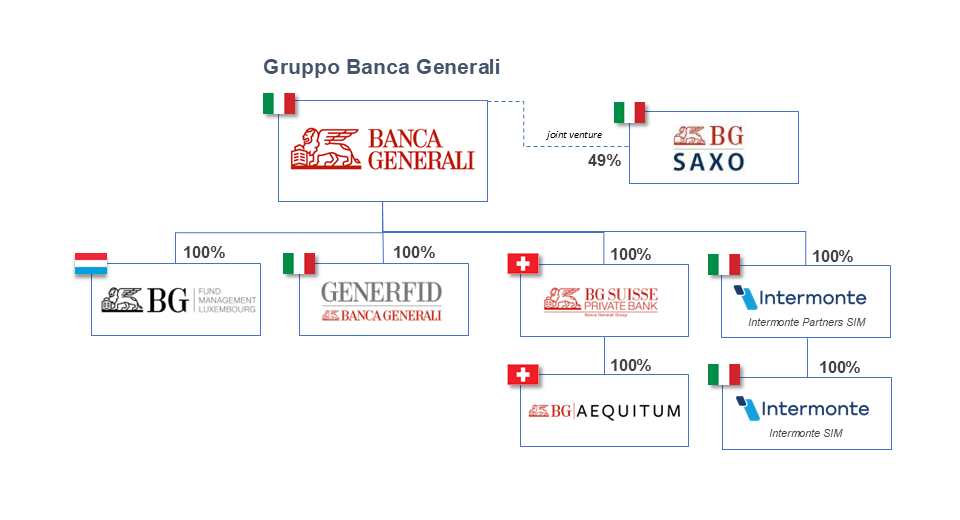 Siamo una banca private quotata dal 2006 alla Borsa di Milano (dal 20 marzo 2017 entrata a far parte dell'indice FTSE-MIB) e controllata al 50,1% da Assicurazioni Generali. Fanno parte del gruppo bancario, di cui siamo capogruppo, le società controllate BG Fund Management Luxembourg SA, Generfid S.p.A., BG Aequitum SA, BG (Suisse) Private Bank SA, Intermonte Partners SIM S.p.A. e Intermonte SIM S.p.A.