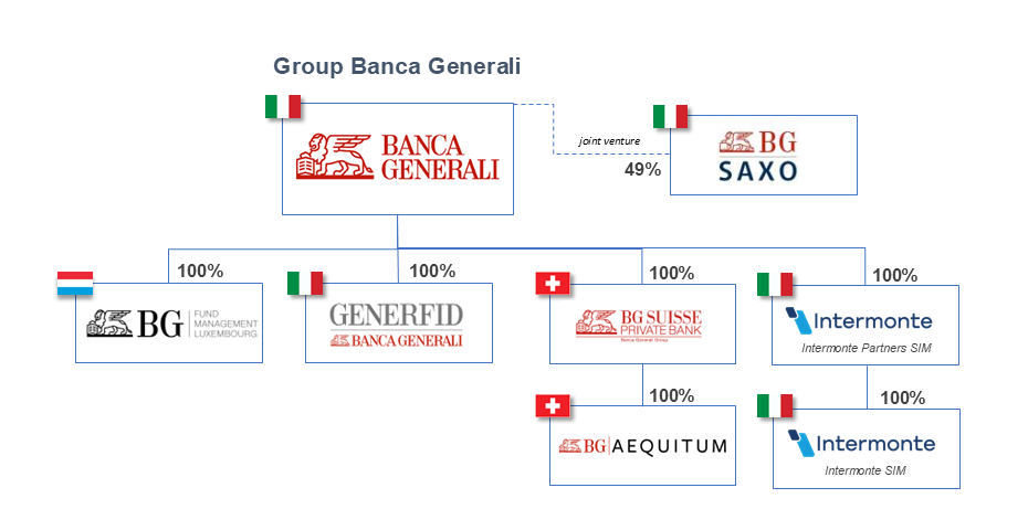 We are a private bank listed on the Milan Stock Exchange since 2006 (which became part of the FTSE-MIB index from March 20th, 2017) and 50.1% of its share capital is controlled by Assicurazioni Generali SpA. Banca Generali controls: BG Fund Management Luxembourg SA, Generfid S.p.A., BG Aequitum SA, BG (Suisse) Private Bank SA, Intermonte Partners SIM S.p.A. and Intermonte SIM S.p.A.